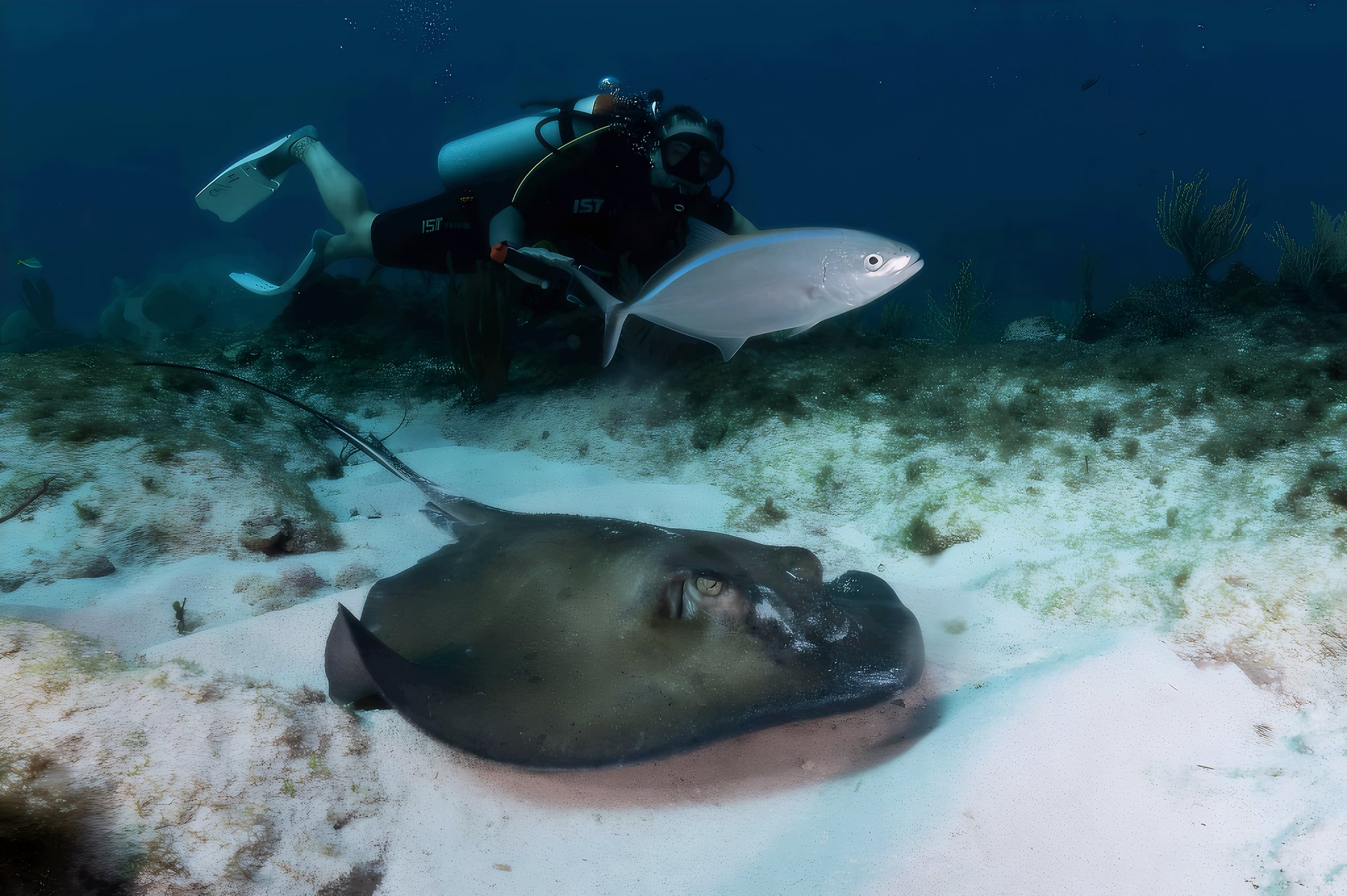 Diving on a reef at night is like visiting a completely different city after midnight. Daytime inhabitants, such as parrotfish, seek shelter to sleep in crevices, while hunters and nocturnal creatures come out to explore. Your flashlight becomes the center of the universe, focusing your attention on every detail and revealing colors that sunlight obscures during the day. Get ready for fascinating encounters with color-changing octopuses, lobsters walking along the bottom, giant hermit crabs, and, if you turn off your flashlight for a moment, the incredible magic of bioluminescence, where your every movement creates a trail of bright light in the water.